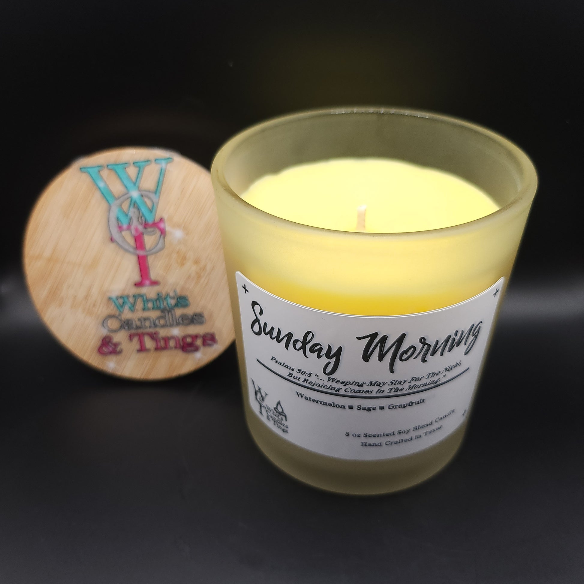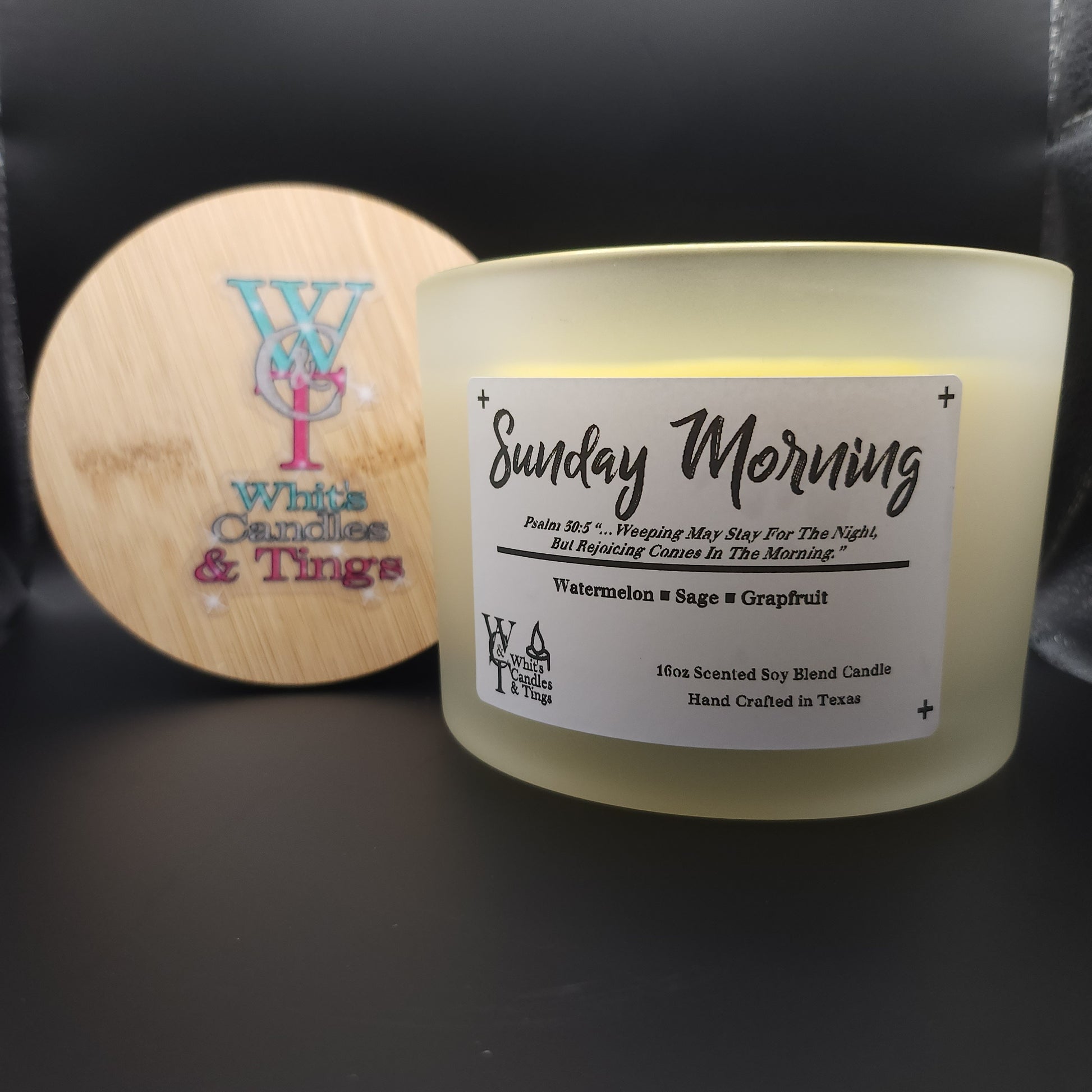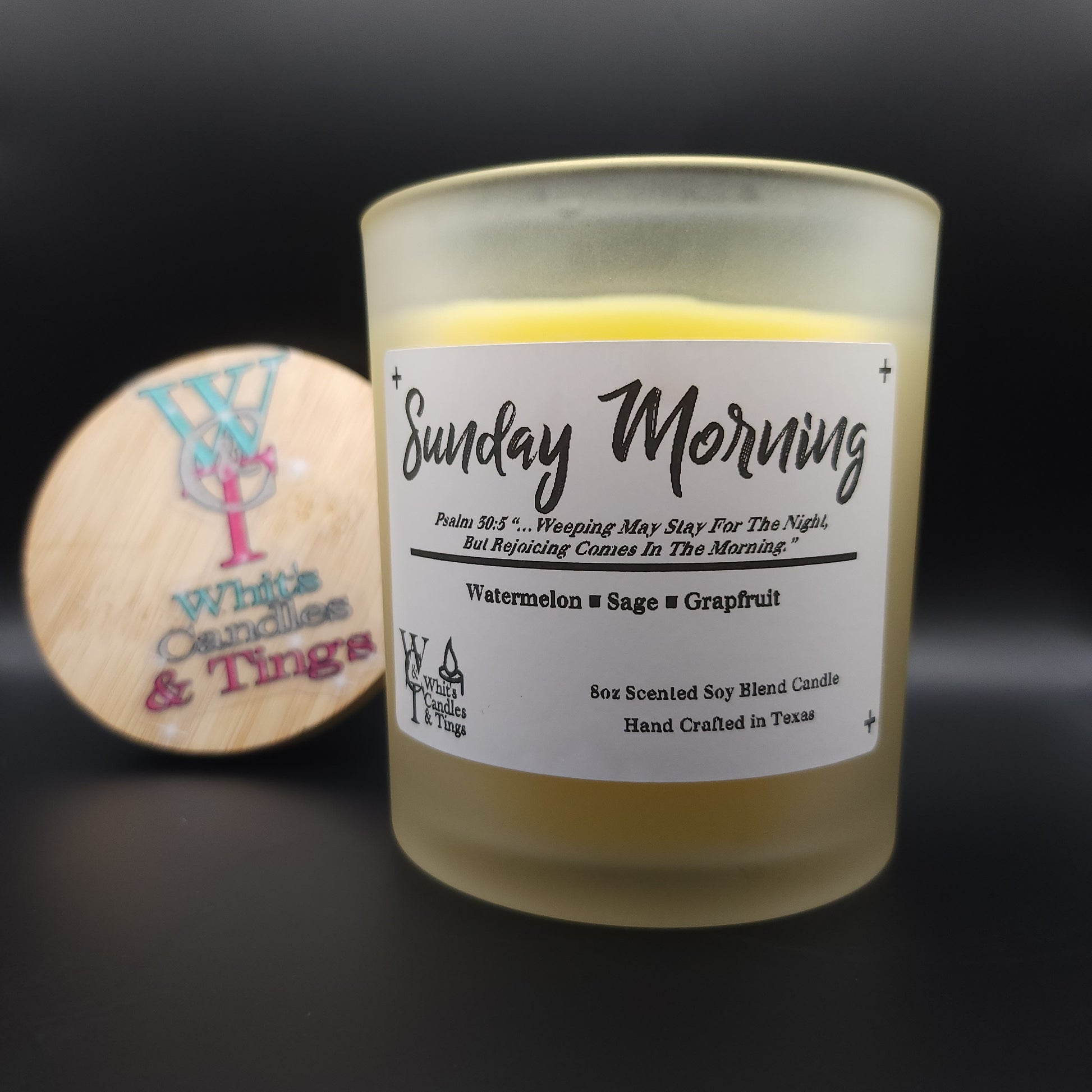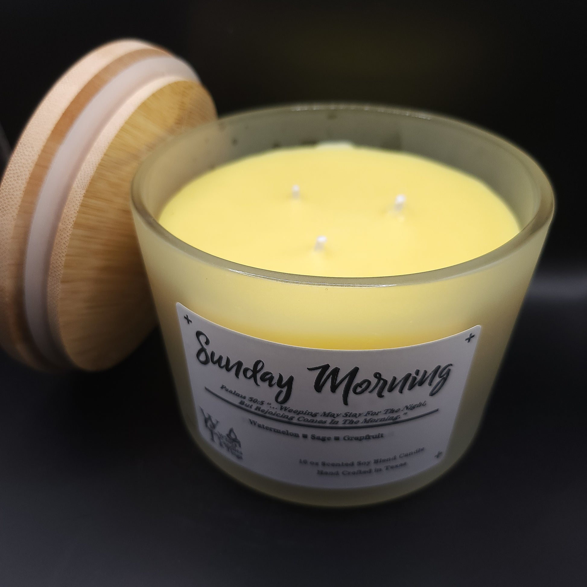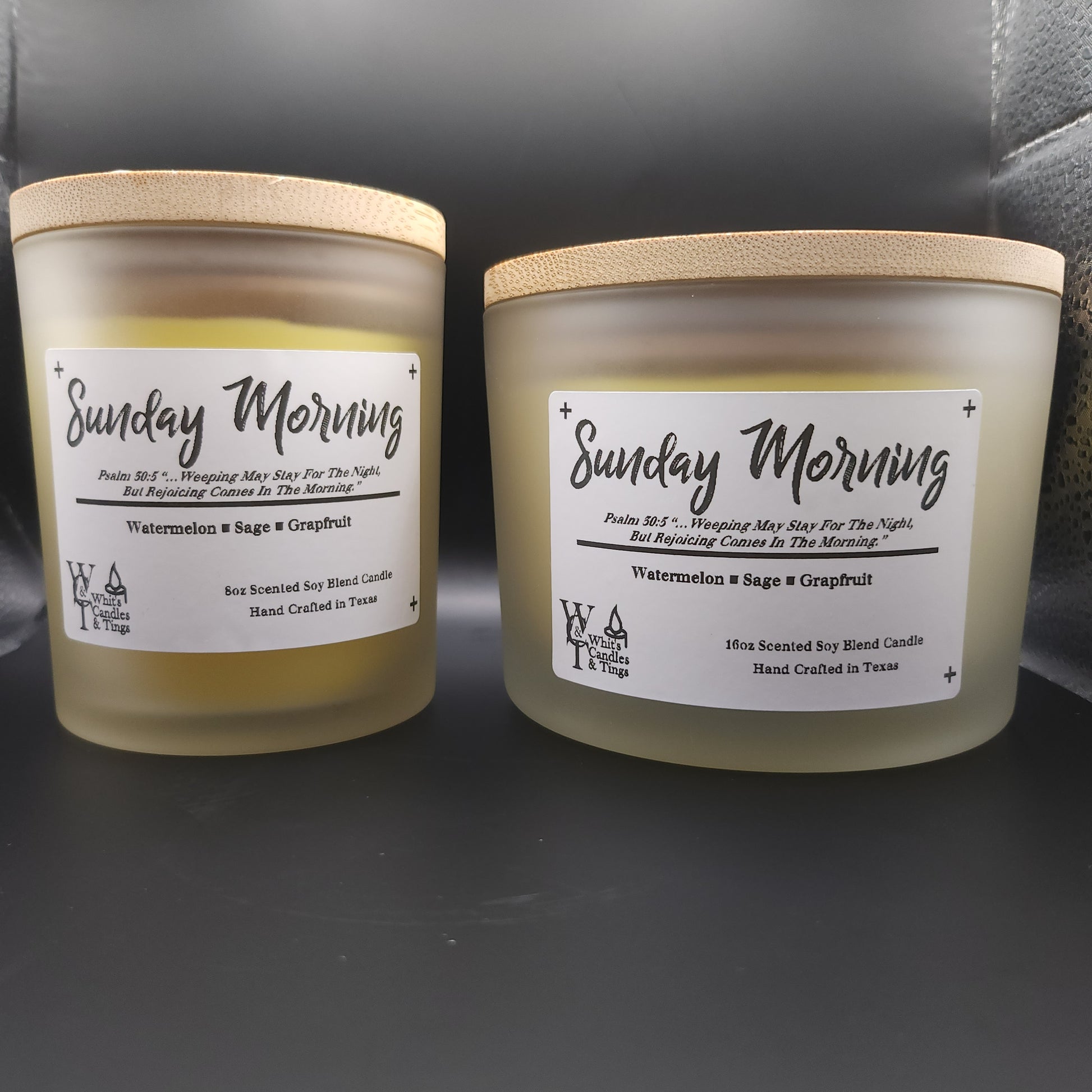 The Sunday Morning scented candle is a part of our yearly faith inspiration candle line. With fragrance notes of sage, watermelon, & grapefruit, this candle is a popular blend for sweet but zesty candle lovers.